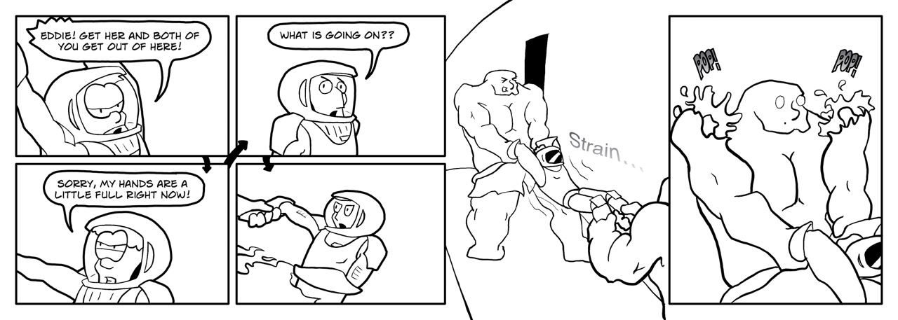 The interested reader may be wondering how in the heck the kid was able to pull that monsters shoulder clean apart before breaking its grip on his arms. Well, the scientists behind the gene modifications that created that monster put a lot of effort into making muscles capable of crushing just about anything into dust while also being capable of extreme endurance without tearing or losing force. On top of that, the skin on their hands has some properties in common with Earth amphibians or the extinct Creamy race, such that these monsters can climb nearly vertical glass walls. To put it simply, these things have a grip stronger than their joints. They weren’t really designed for self-preservation.